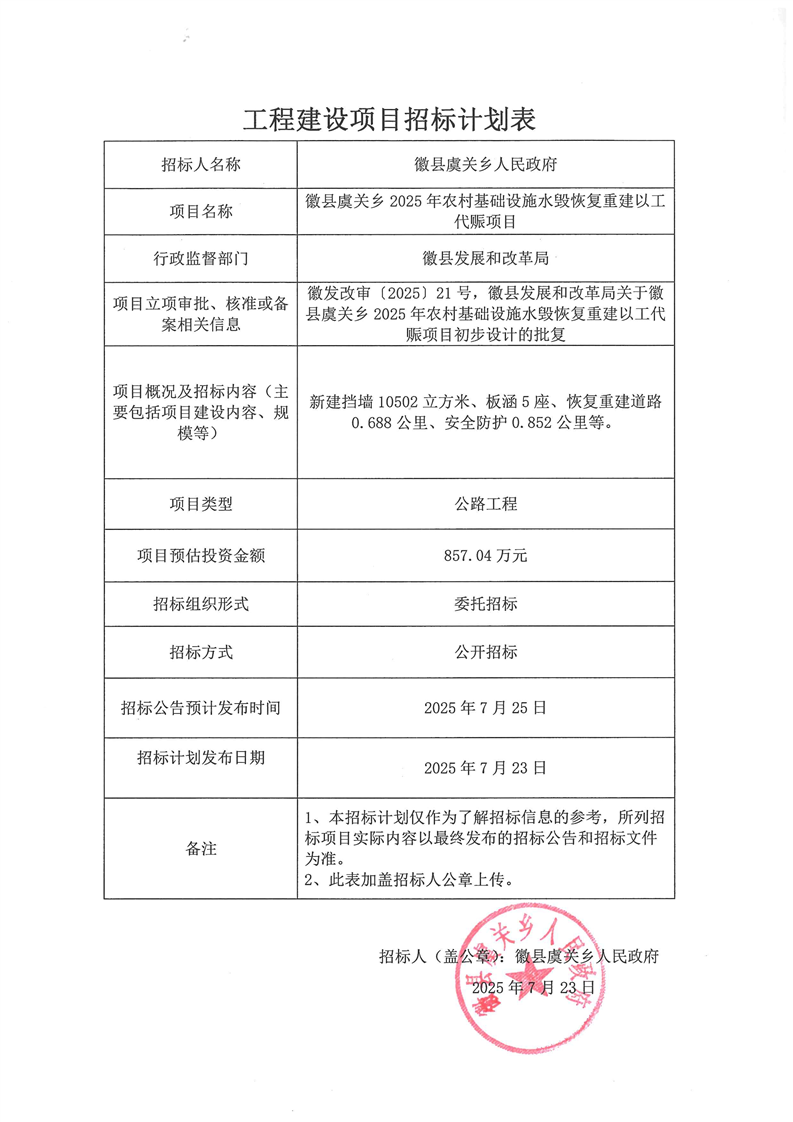 徽縣虞關(guān)鄉(xiāng)2025年農(nóng)村基礎(chǔ)設(shè)施水毀恢復(fù)重建以工代賑項(xiàng)目
