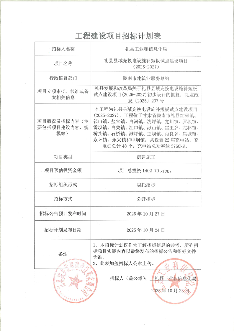 禮縣縣域充換電設施補短板試點建設項目(2025-2027)