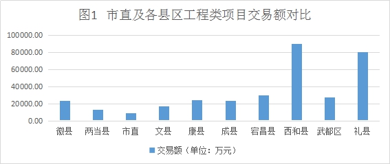 1.工程類項目:市直6項,交易額8655.19萬元;武都區(qū)29項,交易額27254.23萬元;成縣24項,交易額23254.25 萬元;徽縣26項,交易額23476.37萬元;西和縣70項,交易額90305.24萬元;禮縣41項,交易額80922.67萬元;康縣29項,交易額24450.87萬元;文縣17項,交易額17048.62萬元;宕昌縣34項,交易額30189.76萬元;兩當縣7項,交易額13081.40萬元。