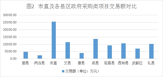 2.政府采購類項目:市直45項,交易額25563.29萬元;武都區(qū)36項,交易額6990.89萬元;成縣34項,交易額13577.85萬元;徽縣20項,交易額4778.48萬元;西和縣34項,交易額10655.60萬元;禮縣35項,交易額10150.20萬元;康縣23項,交易額3886.56萬元;文縣36項,交易額11436.30萬元;宕昌縣35項,交易額9173.00萬元;兩當縣14項,交易額2284.08萬元。